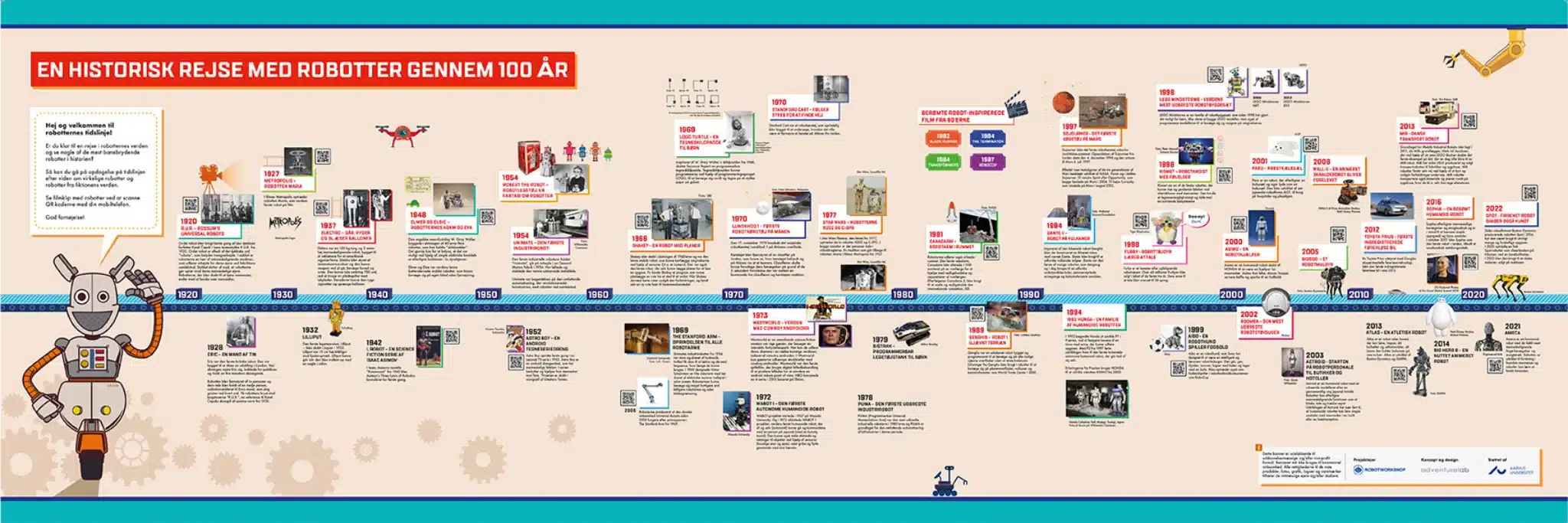 AdventureLAB’s role was to elevate visitor experience with storytelling and experience design. In close collaboration with Robotworkshop and Aarhus University, we created a large-scale timeline, taking visitors through the history of robots. To add another layer of experience, we designed a quiz-based game, which could be played by children aged 12-14 or smaller children with parents. We also designed the event mascot character and elements such as banners, logos and other graphics for printed and digital assets.